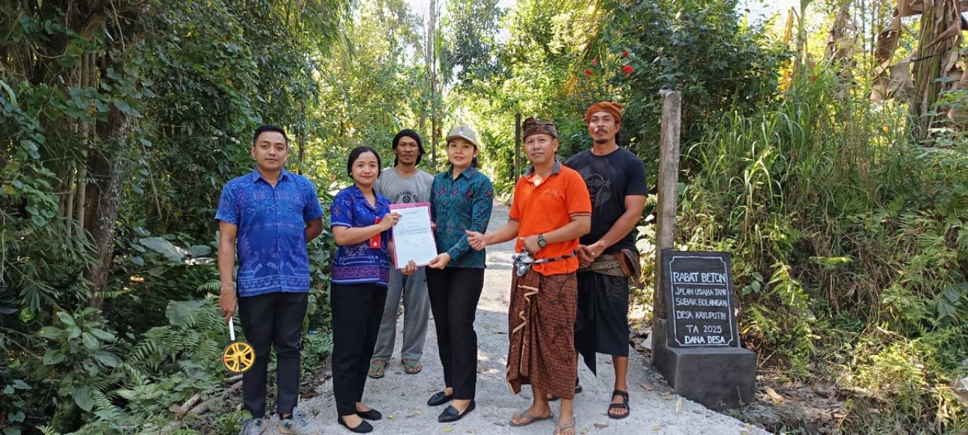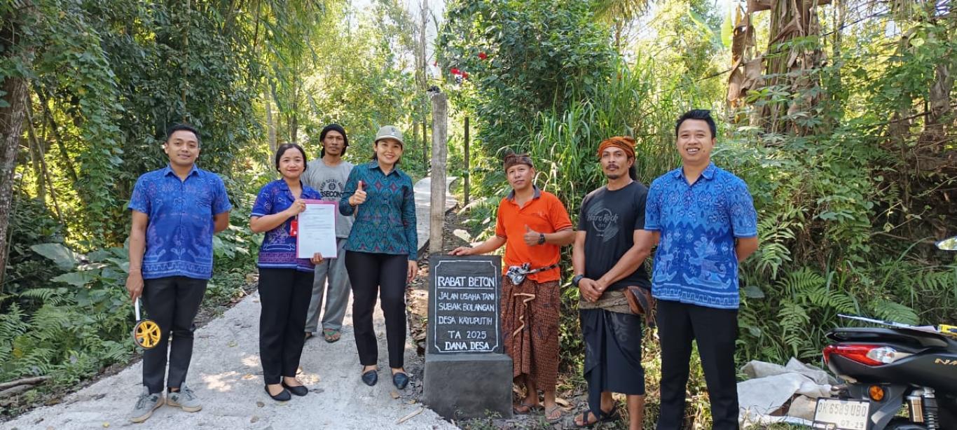 Selasa, 23 September 2025 Perbekel Kayuputih (KADEK DINA NURIANI) melakukan Serah Terima Berita Acara Serah Terima Rabat Beton Jalan Usaha Tani Subak Bolangan di Banjar Dinas Bolangan, Desa Kayuputih, Kecamatan Banjar, Kabupaten Buleleng di dampingi oleh BPD Desa Kayuputih, Tim Pelaksana Kegiatan (TPK) dan Pelaksana Kegiatan Anggaran (PKA) dana yang digunakan untuk Rabat Beton Jalan Usaha Tani Subak Bolangan berasal dari Dana Desa (DD) Tahun Anggaran 2025.